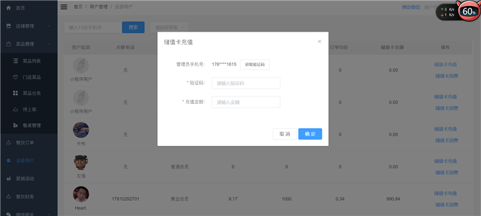 (1)點擊【儲值卡充值】,可以給某個用戶充值,在這個過程中需要管理員手機號驗證后才可以充值成功。