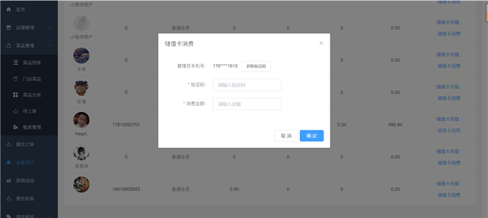 (2)點擊【儲值卡消費】,可以給某個用戶消費儲值卡金額,在這個過程中需要管理員手機號驗證后才可以消費成功。
