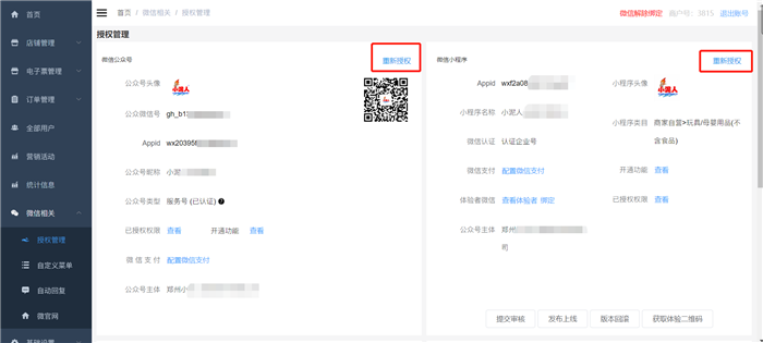 (1)點擊微信相關——授權管理,選擇授權或【重新授權】跳轉到授權頁面