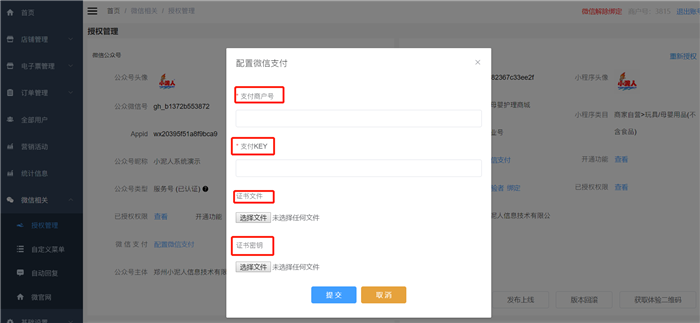 (3)授權成功后,點擊配置微信支付,輸入商戶號、支付key和支付證書密鑰后,點擊提交即可。
