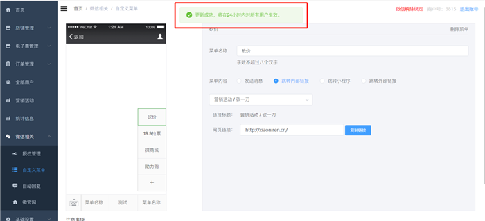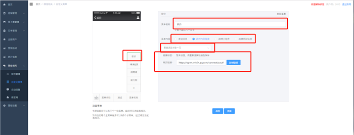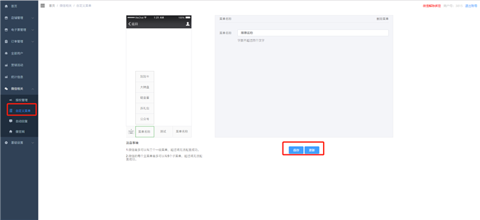 (4)配置完自定義菜單欄后,可以點擊保存,保存到saas里,并不更新到微信端,點擊更新,會更新到微信的公眾號。注意:更新成功后,會在24小時內對所有用戶生效。