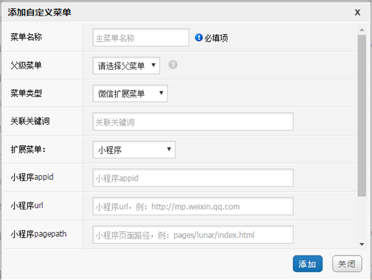平臺總后臺微信設置自定義菜單增加小程序自菜單功能。