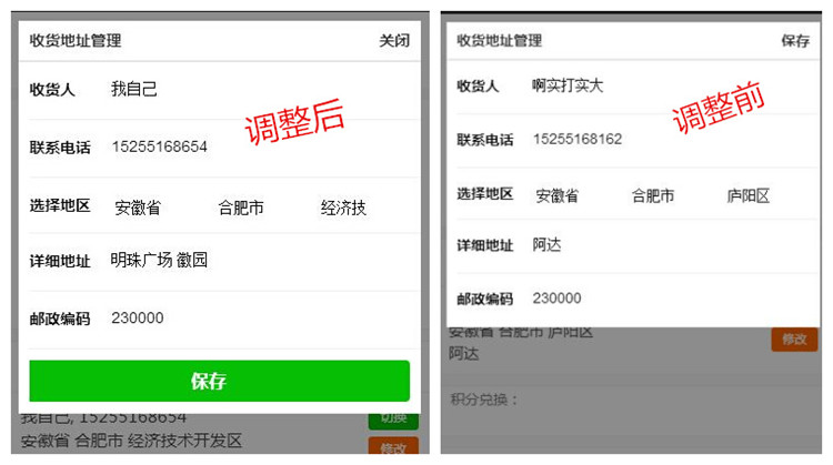 小泥人電商小程序對訂單支付頁面收貨地址彈窗進行了功能優化。當用戶點擊修改收貨地址,進入彈窗頁面時,其功能變化主要表現在兩個方面(前后變化如圖):