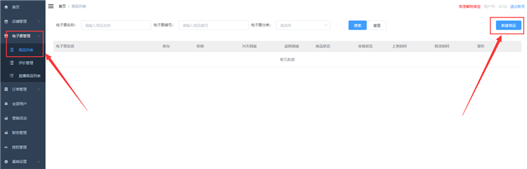 2、點擊左側的電子票管理,然后點擊商品列表,點右上角的新增商品;