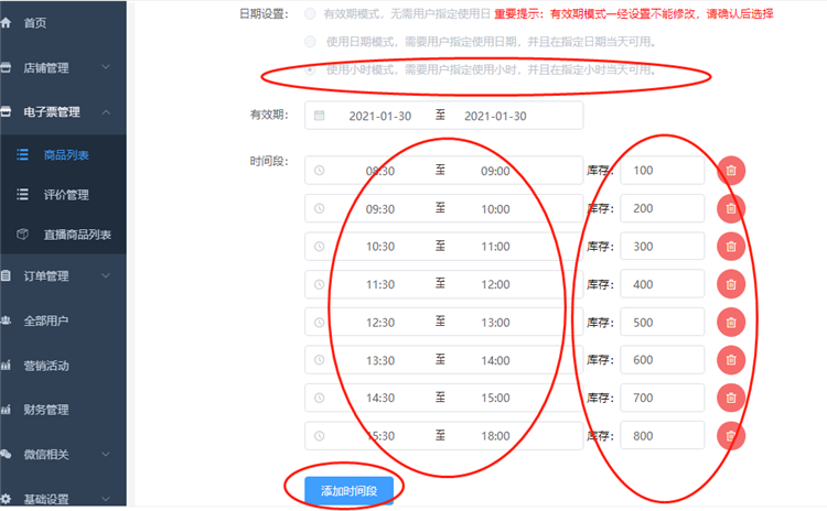 (3)當設置使用小時模式時,可根據自身實際情況自行添加時間段和設置相對應的庫存,一般分時預約都是用這個模式。