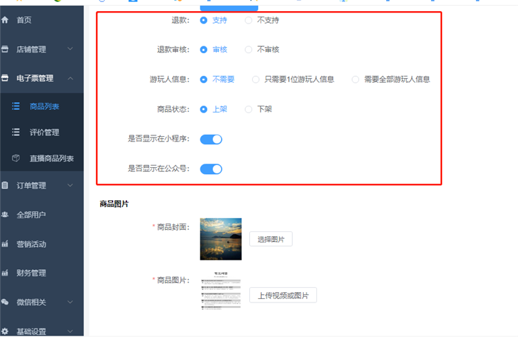 4、設置退款信息、游玩人信息、商品狀態以及是否在公眾號和小程序上顯示,然后上傳商品封面圖和商品圖片;
