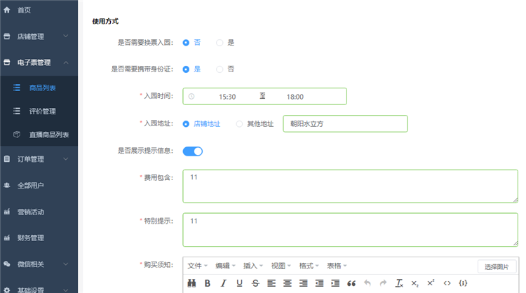 5、設置使用方式,包括是否需要換票入園、是否需要攜帶身份證、入園時間、入園地址、是否展示提示信息、費用包含、特別提示、購買須知等。