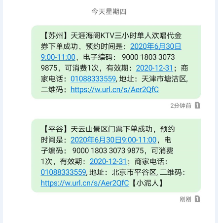 短信內容是客人下單并付款成功后收到的入園憑證,主要由以下幾個信息組成: