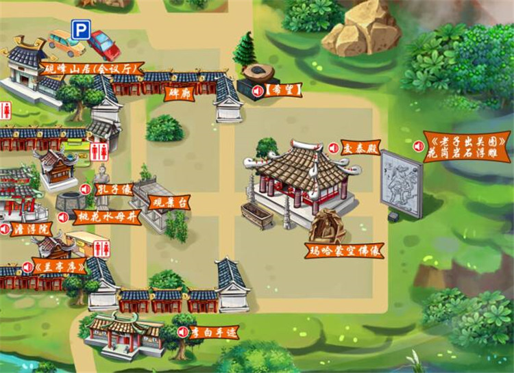 根據景區平面圖,按園區布點繪制手繪地圖,在導覽地圖中可以顯示景區中的景點信息、景點和景點之間的路徑,也可以顯示景區的關鍵地點信息,比如廁所、小賣部、售票處、景區出入口等信息。