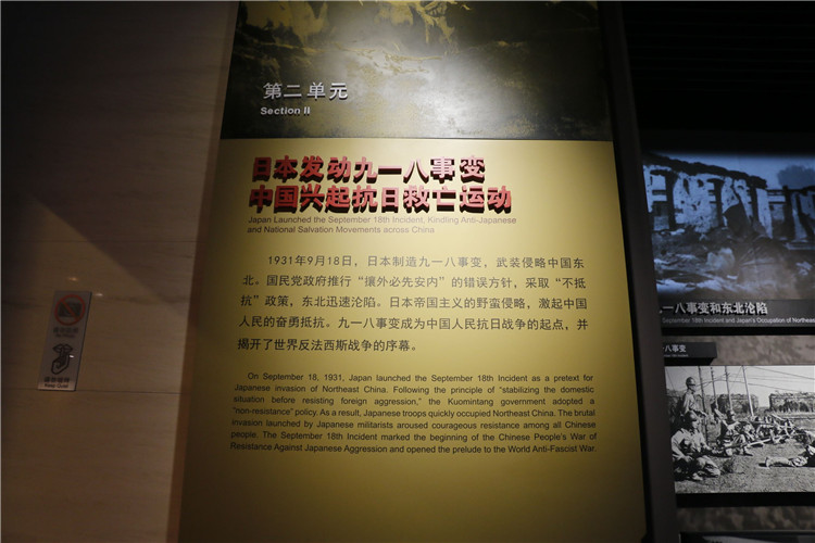 截止至2014年,展陳面積6700平方米,展線約1050延米,展出珍貴歷史圖片640余幅、文物936件套,并輔以雕塑、油畫、國畫等藝術品。展覽以"偉大勝利"為主題,全面再現了中國人民14年浴血抗戰的歷史畫卷。共分八個部分:第一部分:民族危機,救亡興起;第二部分:國共合作、共赴國難;第三部分:抗戰燈塔、中流砥柱;第四部分:日軍暴行、慘絕人寰;第五部分:浴血疆場、民族壯歌;第六部分:得道多助、國際支援;第七部分:歷史勝利、巨大貢獻;第八部分:以史為鑒、面向未來。