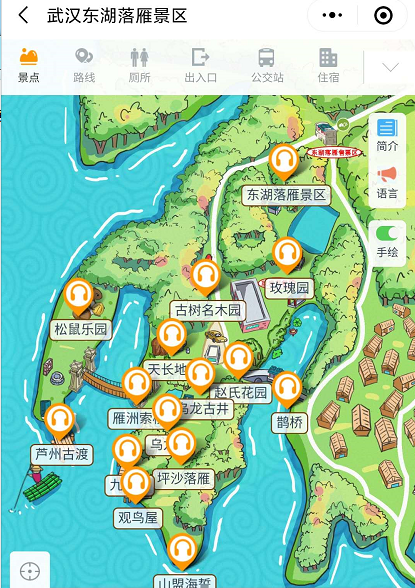 2020年東湖落雁景區電子導覽、語音講解、手繪地圖等智能導覽系統功能上線了!東湖落雁景區是國家5A級東湖風景名勝區的重要組成部分,它北依白馬景區,南與磨山景區隔湖相望,東臨青王公路,規劃用地總面積為10.24平方公里,其中陸地5.92平方公里,水域4.32平方公里。