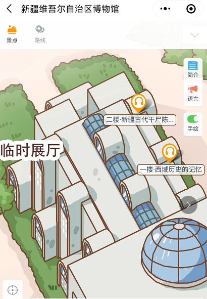 2020年新疆維吾爾族自治區博物館電子導覽、語音講解、手繪地圖等智能導覽系統功能上線了!新疆維吾爾自治區博物館于1959年正式成立,原館初步設計是農業展覽館,為山字形平房建筑,1962年遷至現址改為博物館并對外開放。