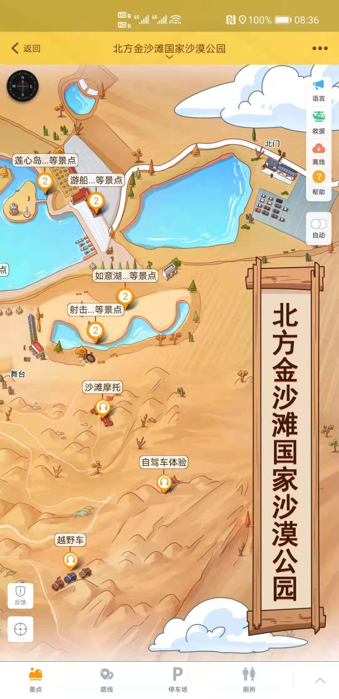北方金沙灘國家沙漠公園智能導覽系統有1條全景游的推薦路線,4個美食餐廳,還有游客中心,停車場,出入口,廁所,住宿,公交站等多個服務點。北方金沙灘國家沙漠公園智能導覽系統有28個手繪功能點,垂釣,飛行體驗,騎駱駝,敖包,篝火煙花,滑沙等等。