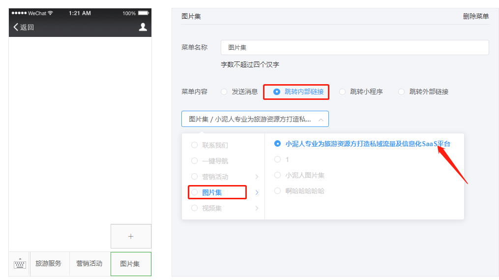 (2)配置在公眾號菜單欄,在“微信相關”--“自定義菜單”增加圖片集欄目,選擇跳轉內部鏈接指向圖片集的對應集合名稱;