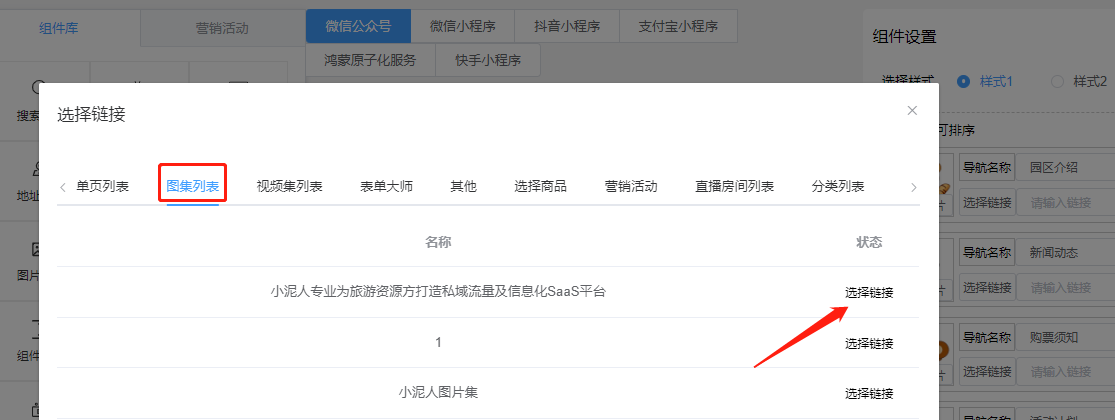 (3)配置到商城,在“店鋪裝修”中搭建商城時通過店鋪菜單、圖片導航等組件均可跳轉鏈接,可以直接選擇鏈接—圖集列表—指向對應的圖集名稱。