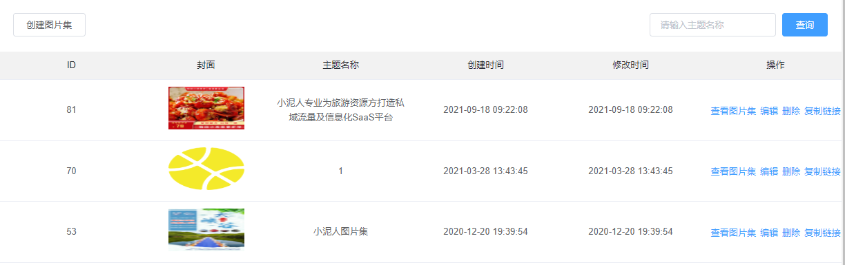 1、首先打開“營銷活動”--“圖片集”功能,這里會對之前創建的圖片集做展示,可以根據主題名稱查詢圖片集、查看圖片集內容、編輯或刪除圖片集、也可以復制鏈接放置想展示的跳轉頁面。