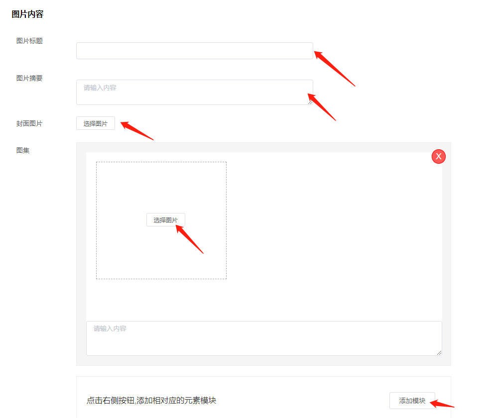 2、對于新商家首次進入圖片集,可以點擊左上角“創建圖片集”來上傳圖片制作,填寫圖片標題、圖片摘要、封面圖,在圖集中選擇圖片,每個圖片都可以輸入展示的文本內容。點擊“添加模塊”是新增圖片選擇。創建完成點擊保存即可!