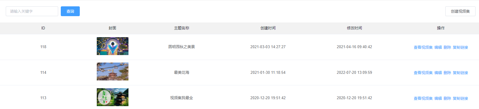 1、打開“營銷活動”中的“視頻集”,可以看到已創(chuàng)建的視頻主題創(chuàng)建時間,可以查看視頻集的內(nèi)容、編輯刪除視頻集以及復制視頻集鏈接