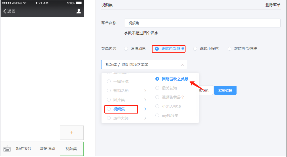 (2)配置在公眾號菜單欄,在“微信相關(guān)”--“自定義菜單”增加視頻集欄目,選擇跳轉(zhuǎn)內(nèi)部鏈接指向視頻集的對應集合名稱;