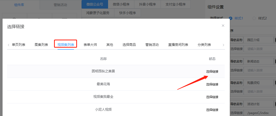 (3)配置到商城,在“店鋪裝修”中搭建商城時通過店鋪菜單、圖片導航等組件均可跳轉(zhuǎn)鏈接,可以直接選擇鏈接—視頻集列表—指向?qū)囊曨l集名稱。