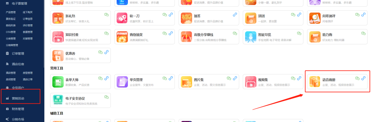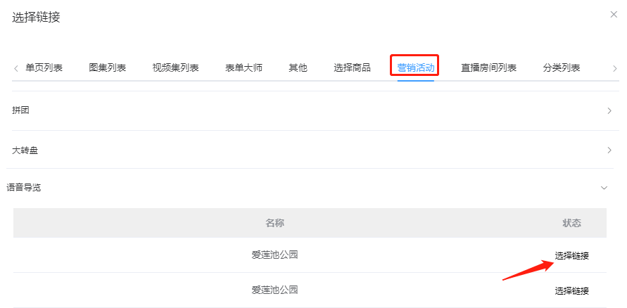 (2)配置在商城頁:在“店鋪裝修”中,輪播廣告、店鋪菜單、圖片導航等組件都可以選擇鏈接—營銷活動—語音導覽—畫冊鏈接