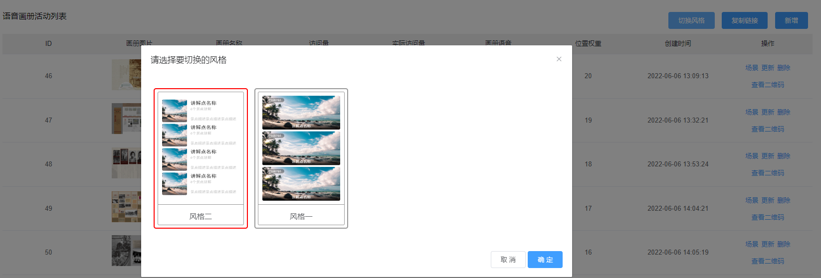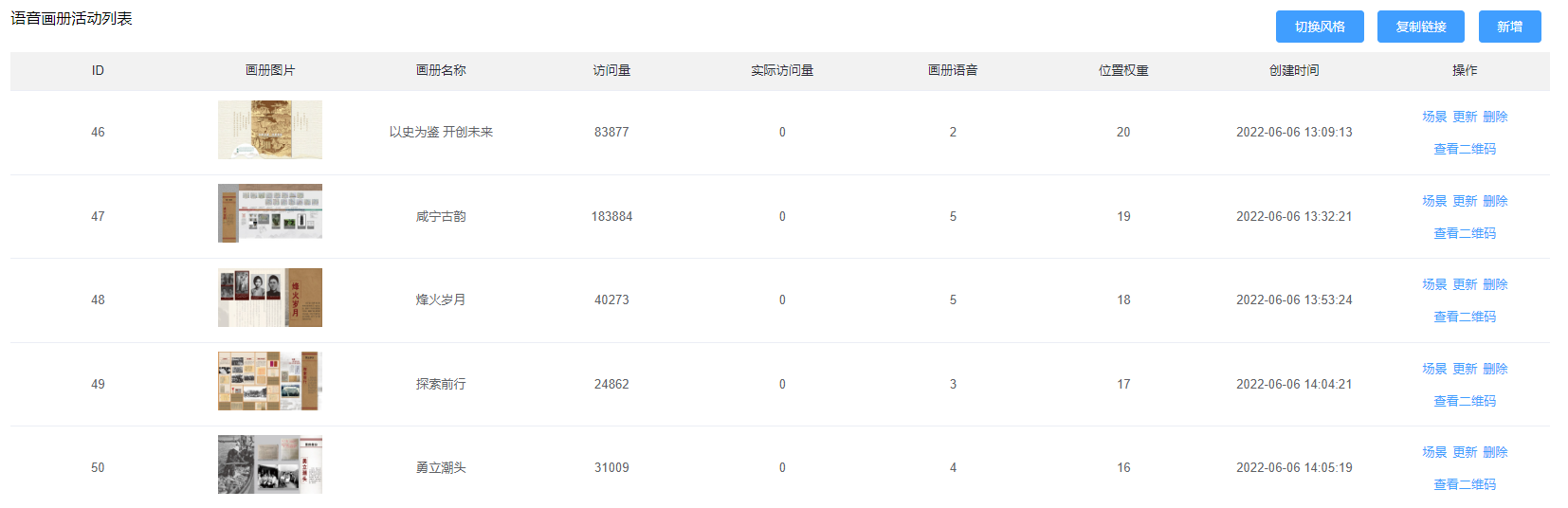 1、打開“語音畫冊”功能首頁可以查詢已創建的畫冊名稱、訪問量、設置場景、修改刪除、查看二維碼等操作。