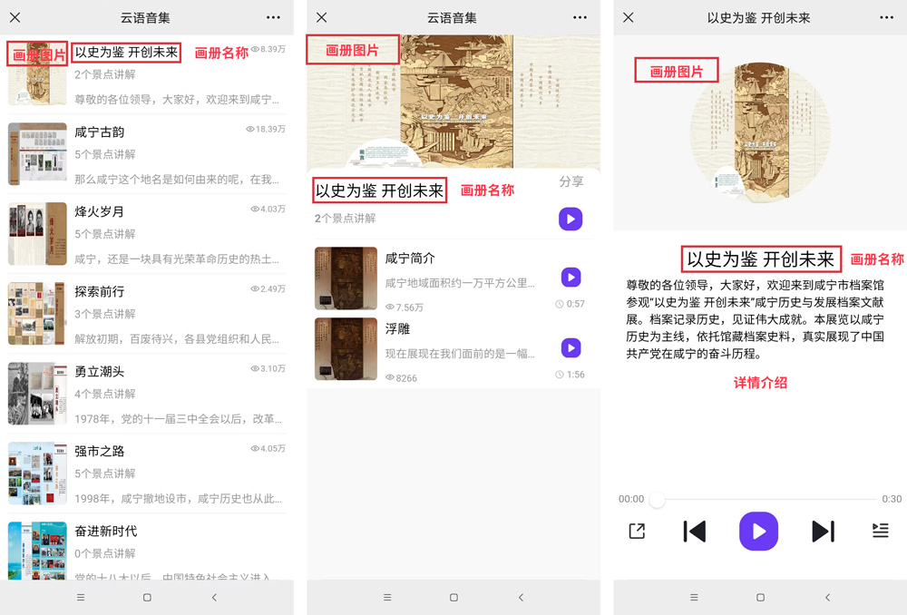 (3)新增:點擊“新增”創建畫冊,填寫畫冊名稱、畫冊圖片(畫冊的封面圖)、場景音頻、詳情介紹。下面是新增畫冊的各項配置在移動端的展示示例: