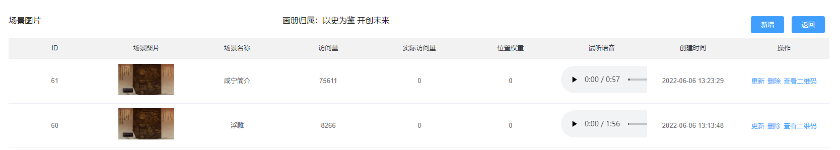 2、創建場景,點擊畫冊后的“場景”按鈕,可查看該畫冊下的場景信息,新建場景、更新修改場景、刪除場景、查看下載場景二維碼