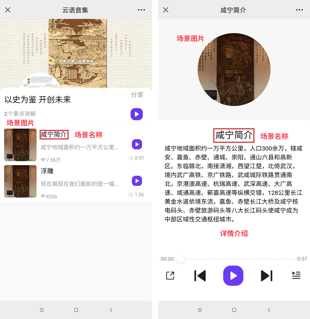 (1)新增:點擊新增創建場景,填寫場景名稱、場景圖片、場景音頻、詳情介紹等信息,以下是場景的移動端展示示例: