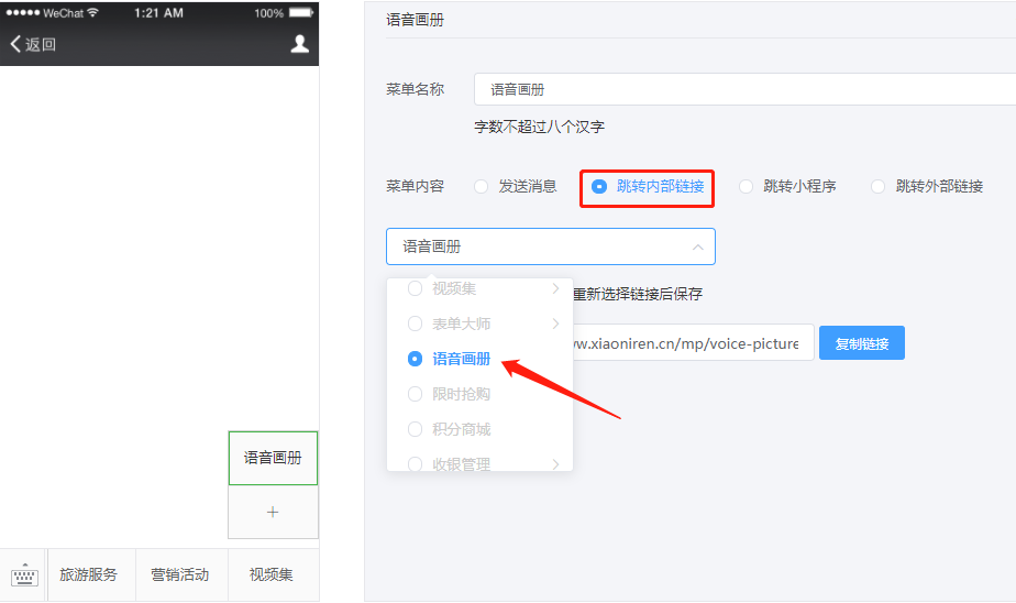 (1)配置在公眾號菜單欄:在“微信相關”——“自定義菜單”中創建語音畫冊菜單,跳轉內部鏈接-語音畫冊,保存更新客戶便可在公眾號直接查看了。