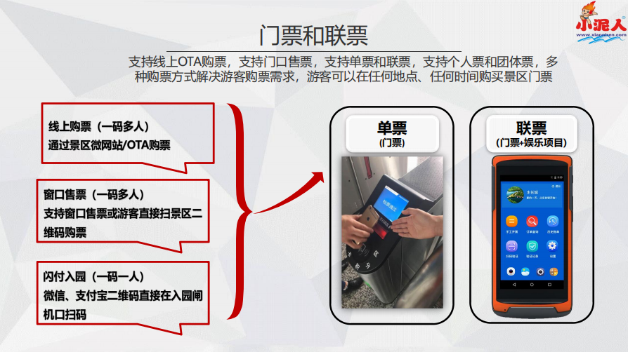 小泥人票務系統是一款可以是實現與多地文旅局對接及OTA對接、票務分銷、酒店、收銀、餐飲、智能導覽等多功能系統。