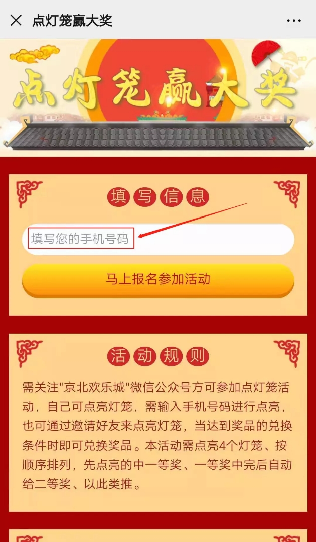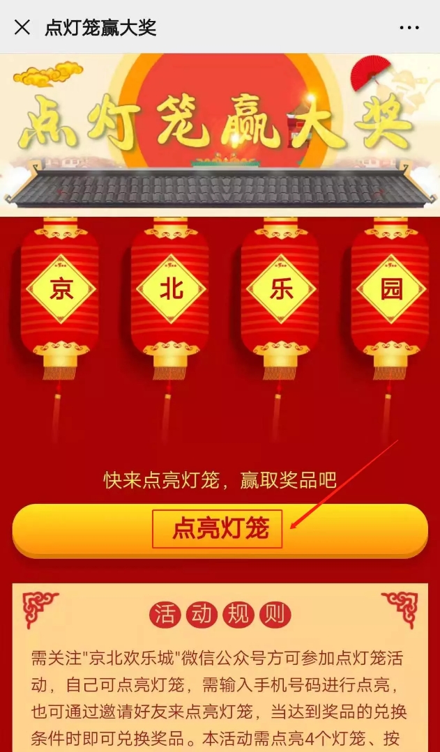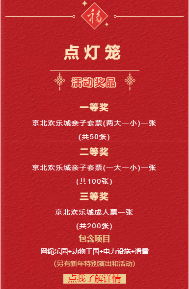 在這里我們就以京北歡樂城為例,首先要與商家進行溝通活動中各種需要的文件及圖片,然后就要在小泥人系統后臺進行活動配置,通常點燈籠活動最重要的是全部點完的概率,如果設的太小,客戶會失去耐心并放棄;設的太大,就達不到做活動吸粉的效果,所以一般都會根據燈籠的數量按1:1.5的比例設置概率。再有就是活動時間要具有限時性,讓用戶有緊張感,更快的達到吸粉的效果。最后就是獎品的設置,例如京北歡樂城(如下圖),獎品的價值不應太小,各獎品之間的價值不應過大,獎品的價值太小會造成顧客沒有參加的欲望與激情,就偏離了活動的目的,獎品之間的價值過大的話,會造成后續粉絲參加的動力,覺得這個獎勵可有可無。