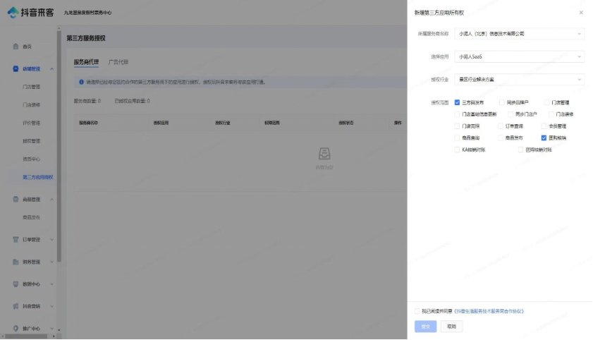 3、商家使用“抖音景區預定”的條件,需入駐「抖音來客」,對接小泥人系統,在商家來客后臺進行三方應用授權對接,授權給小泥人。抖音原生團購景區預售券產品目前僅支持通過三方直連接口上架,打通商家抖音來客與小泥人直連,通過小泥人系統對接上架!