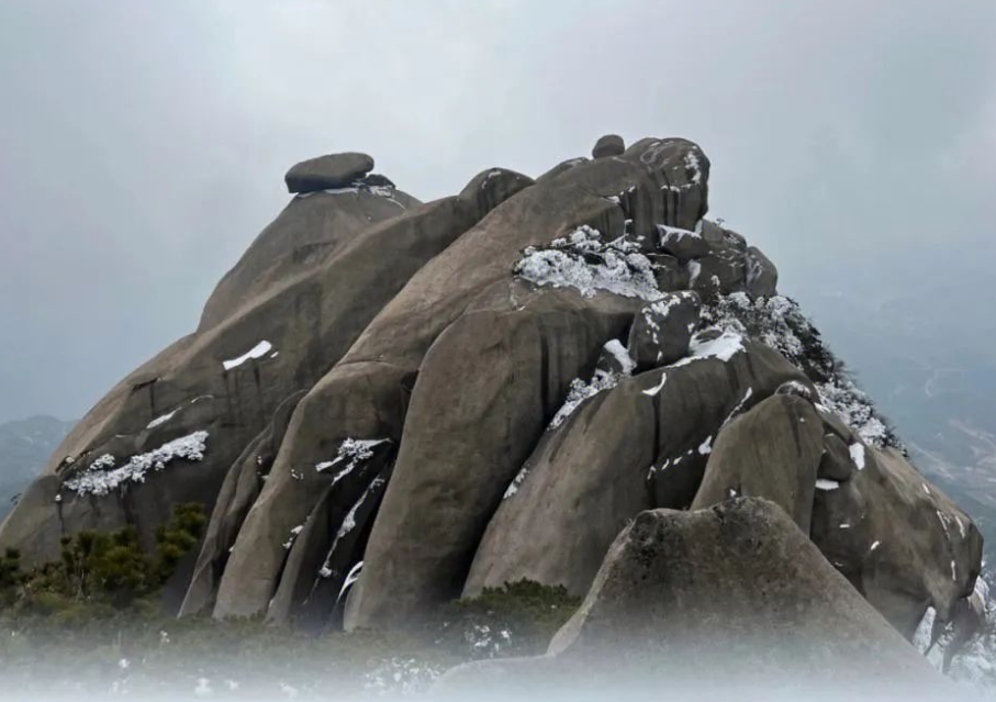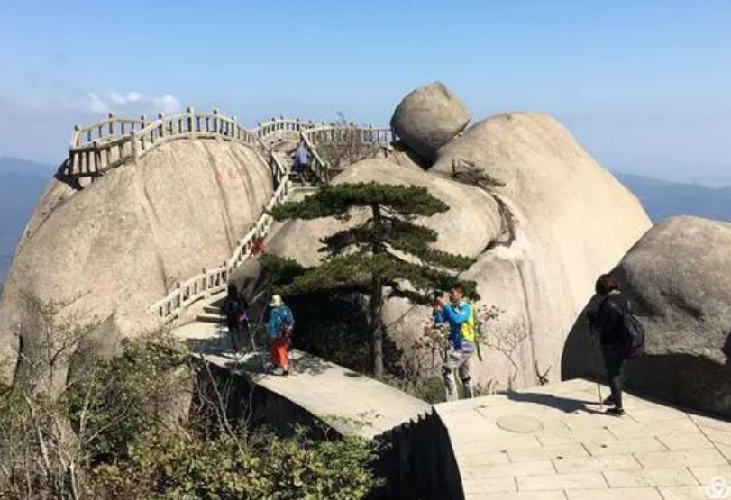 蓬萊峰三面岸陡壁削,峰頂狹長絕險,古木護石,葛蔓繞膝,險象從生。峰頂在云海中若隱若顯,上得蓬萊島,如入瑤池境!